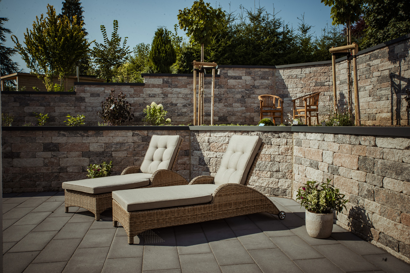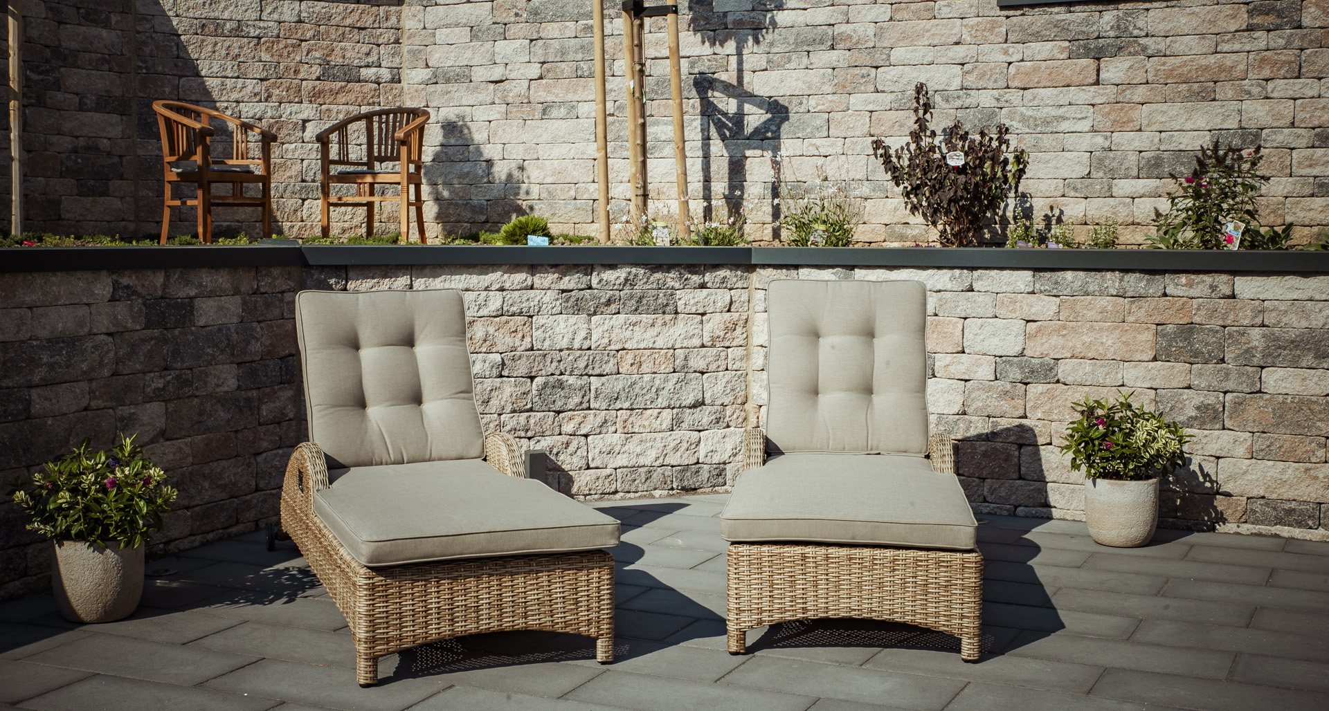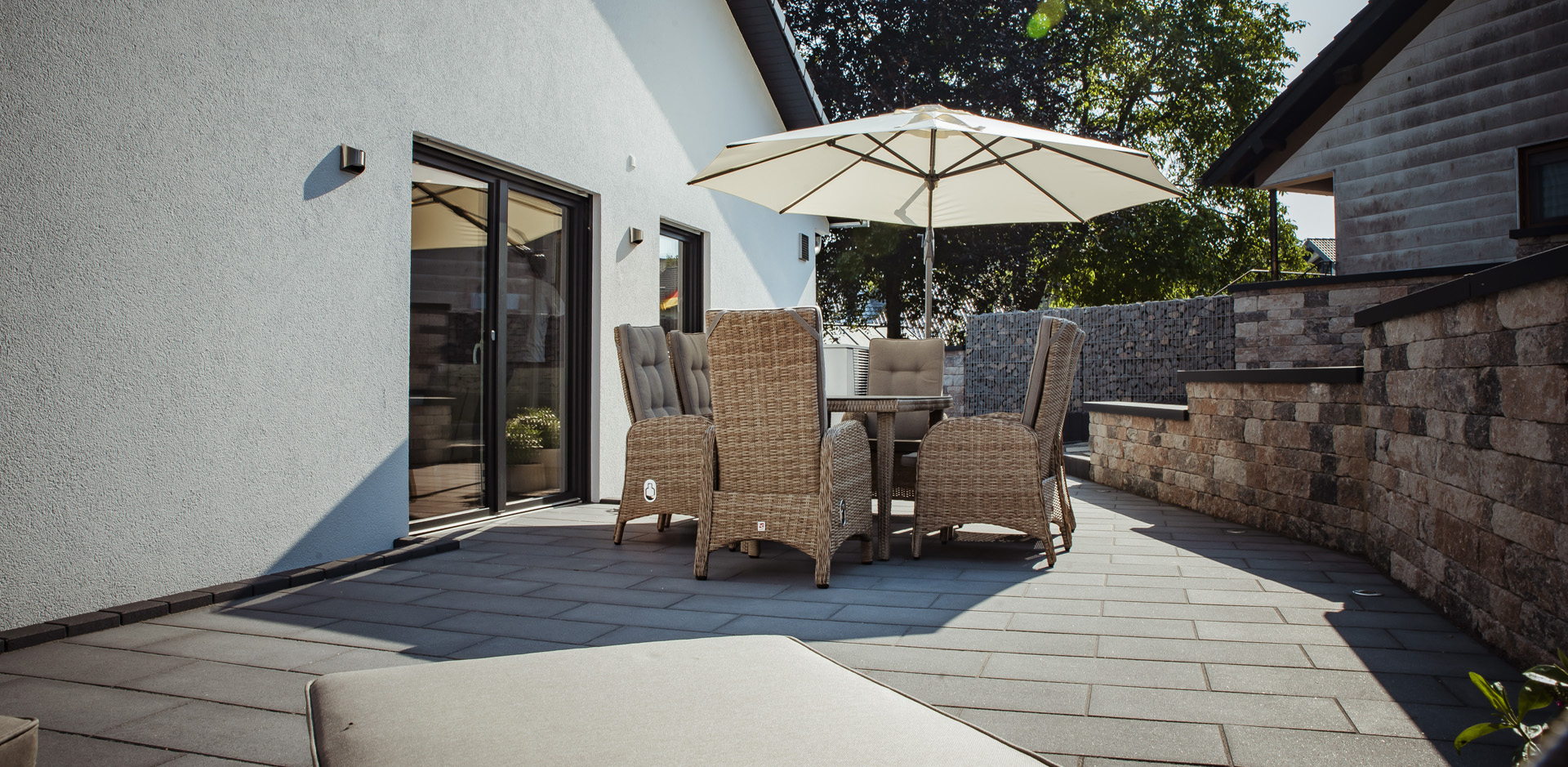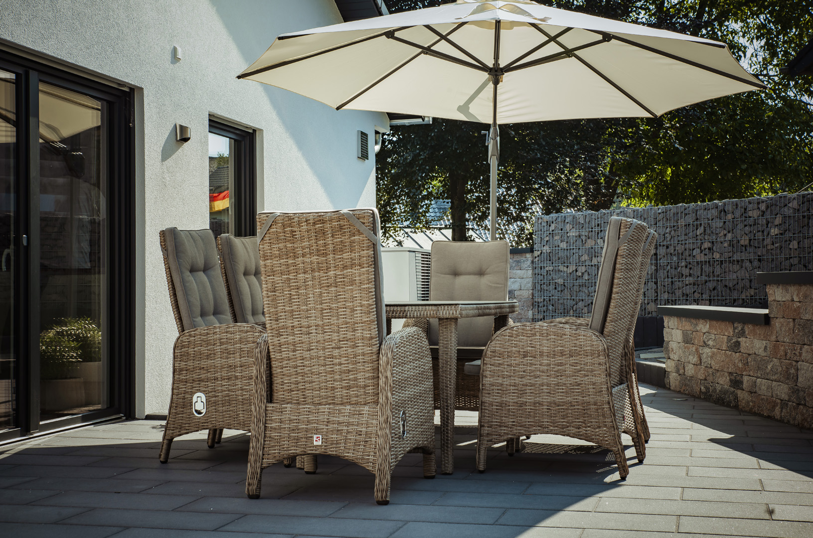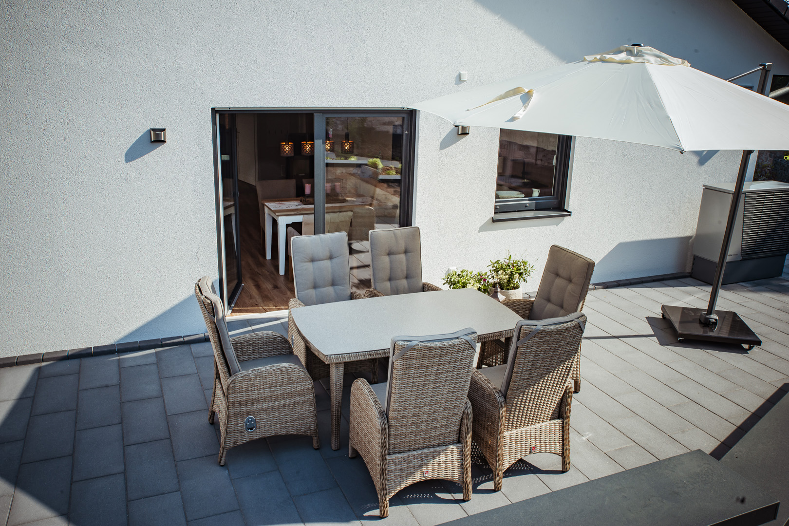 Auf der Sonnenterrasse kann man die Seele baumeln lassen. Sie ist mit einer Sitzgruppe, zwei Sonnenliegen, einem großen Sonnenschirm und einem Gasgrill (mit Gas) ausgestattet. Im Naschgarten mit Beerensträuchern und Kräutern kann sich gerne bedient werden. In der Morgensonne lässt es sich auf der kleinen Sitzgruppe vor der Haustüre beim Plätschern des Brunnens gut frühstücken.