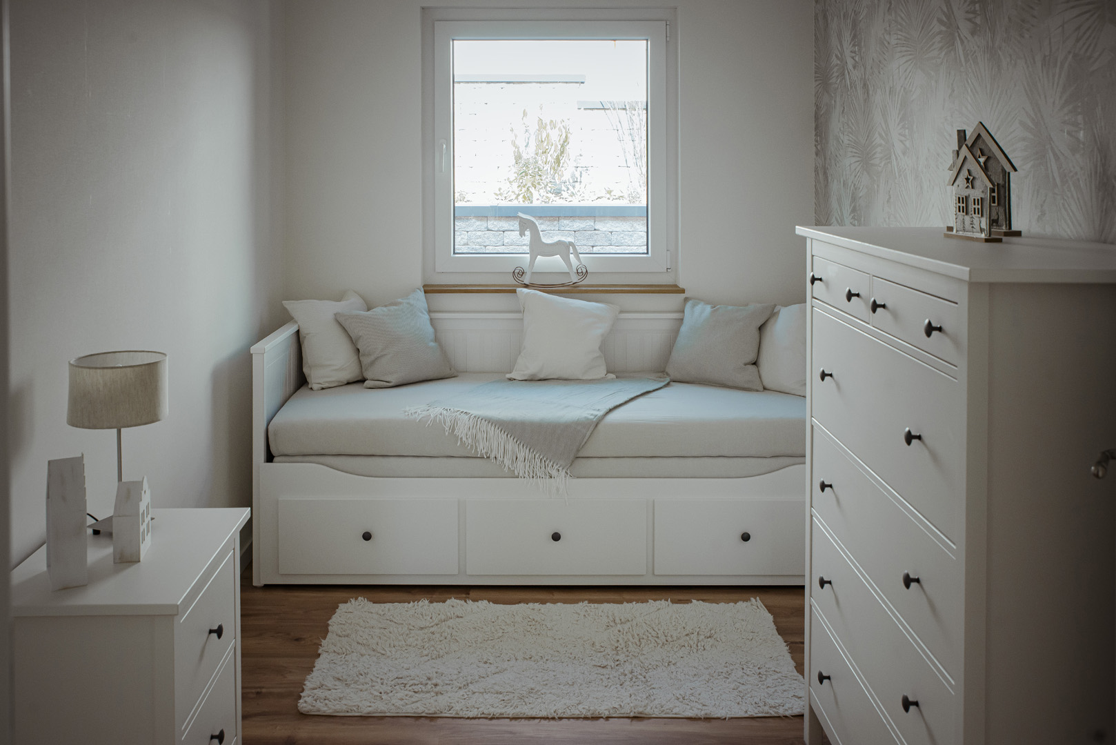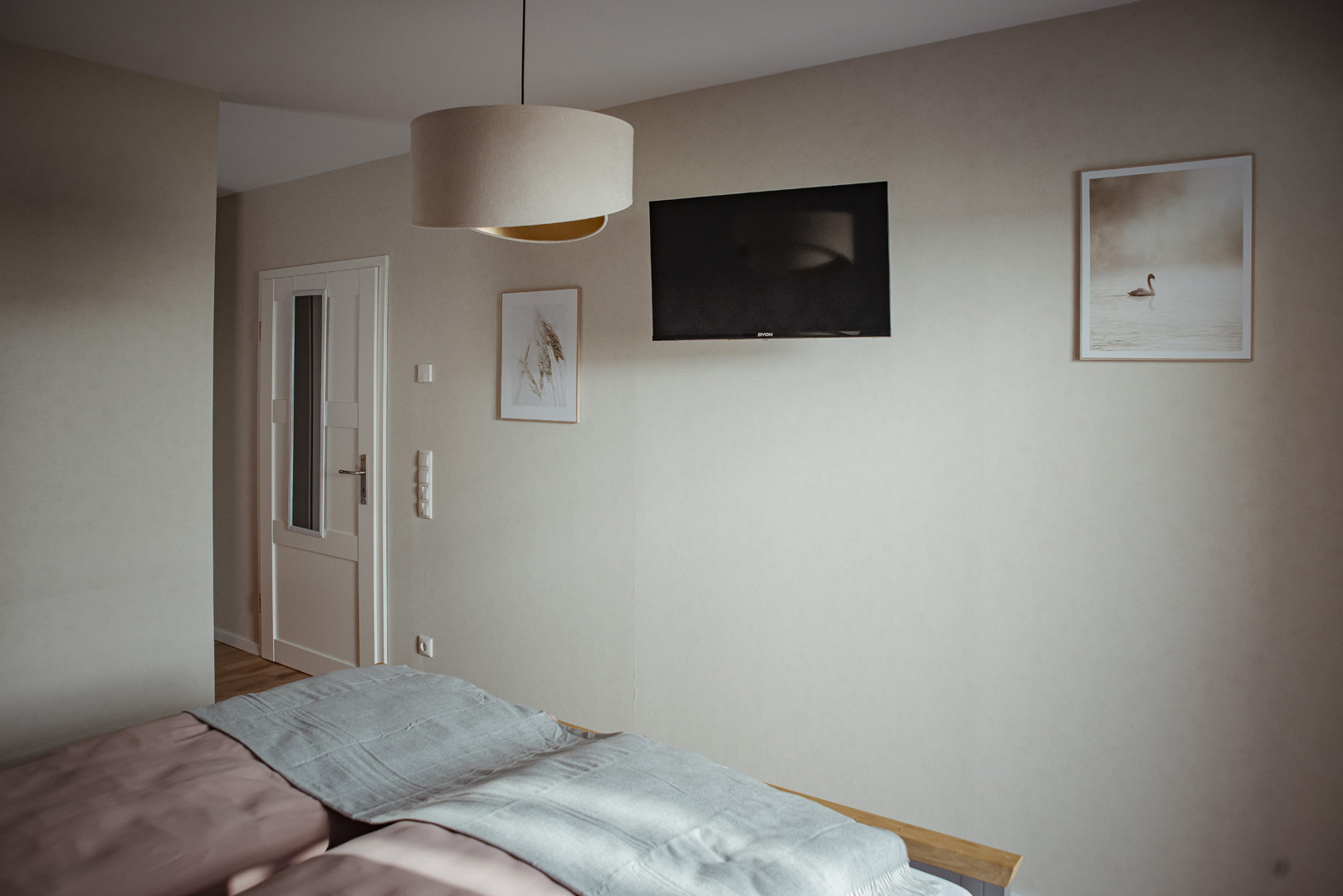 Unser Ferienhaus hat insgesamt zwei Schlafzimmer, eins mit Doppelbett und Fernseher und eins mit einem ausziehbaren Tagesbett.